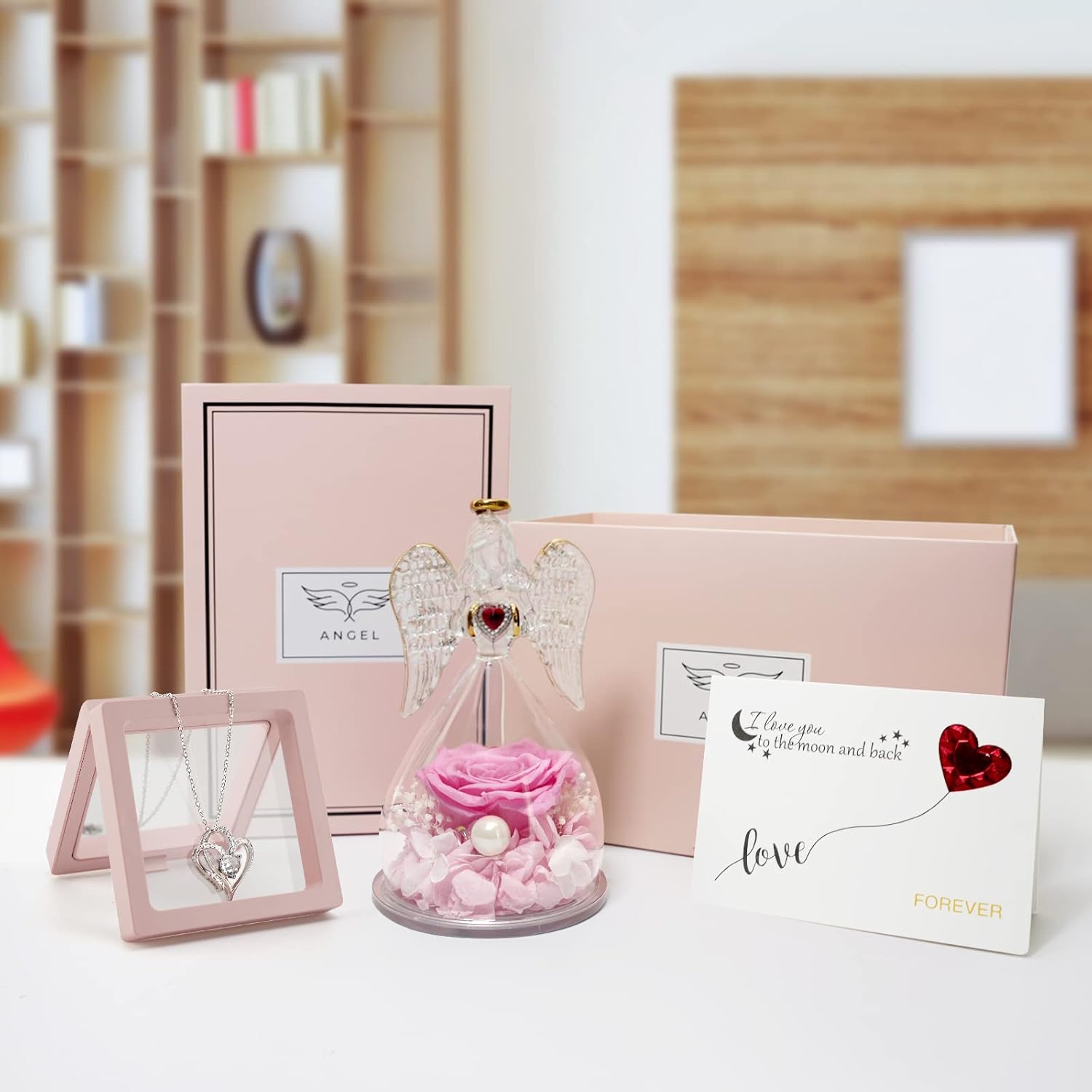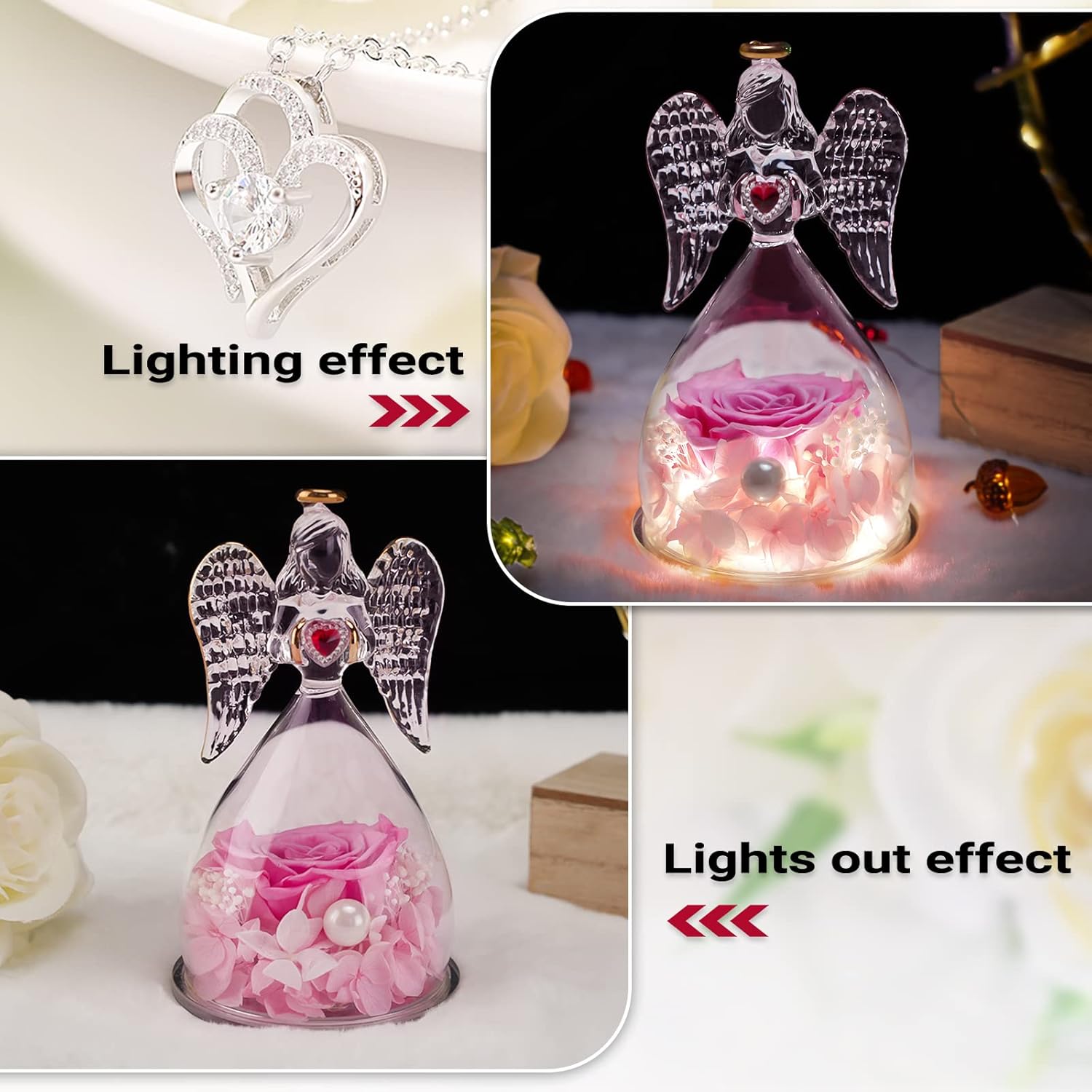 Miofula Cadeau Maman Fete des Meres Rose Eternelle sous Dôme Ange, Cadeau Femme Grand-Mère, Fleur Eternelle avec Collier, Préservé Rose Cadeau Saint Valentin Anniversaire Noël pour Femmes