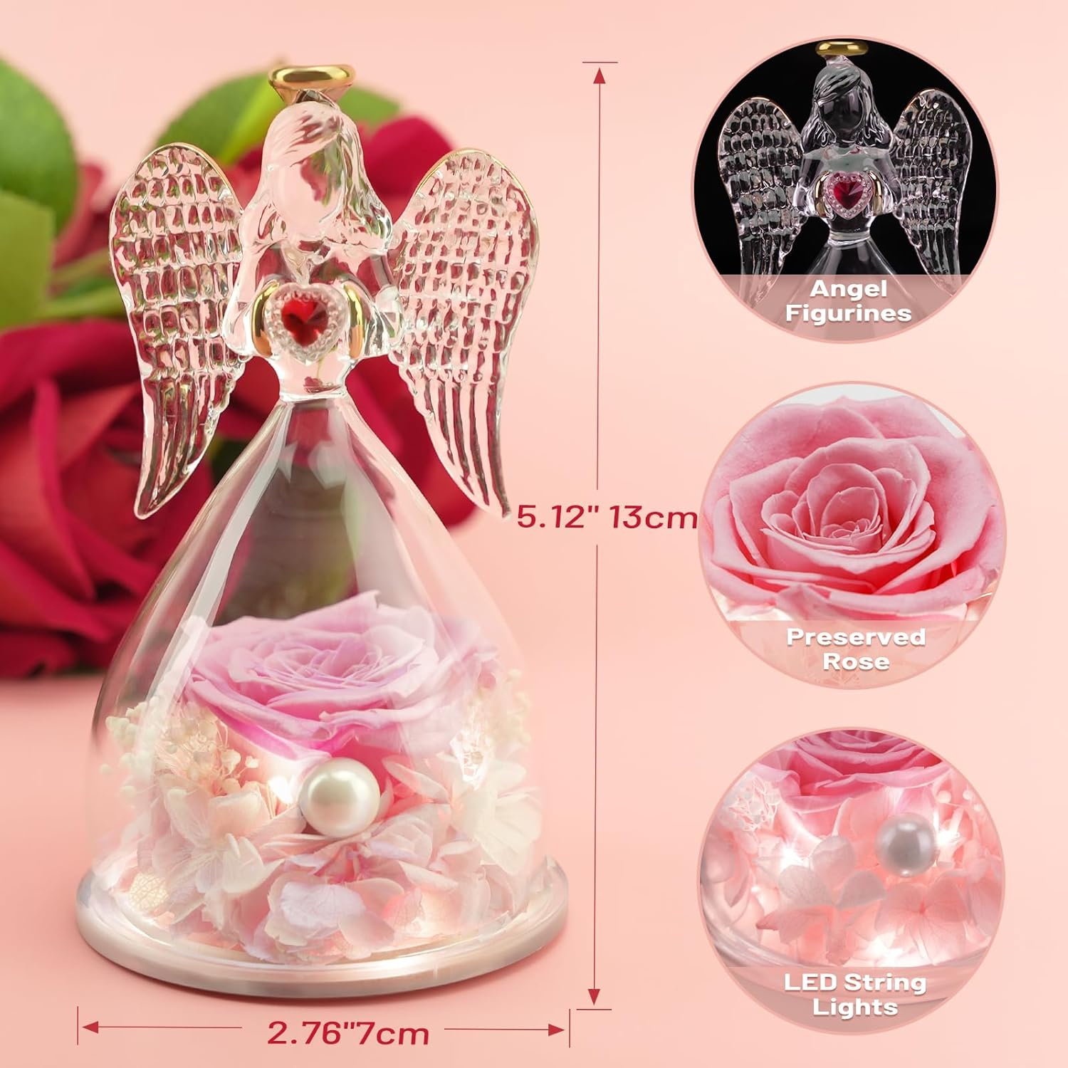 【Accompagner et protéger】: Le halo doré et les ailes déployées des anges peuvent apporter chaleur et protection à votre famille, tandis que le cœur d’amour rouge sur votre main signifie également de bons meilleurs vœux. La petite et délicate Rose éternelle en forme d’ange est également un bon choix pour décorer les chambres, les salons, les bureaux et autres lieux. Taille de l’ange: 7*7*7*13cm.